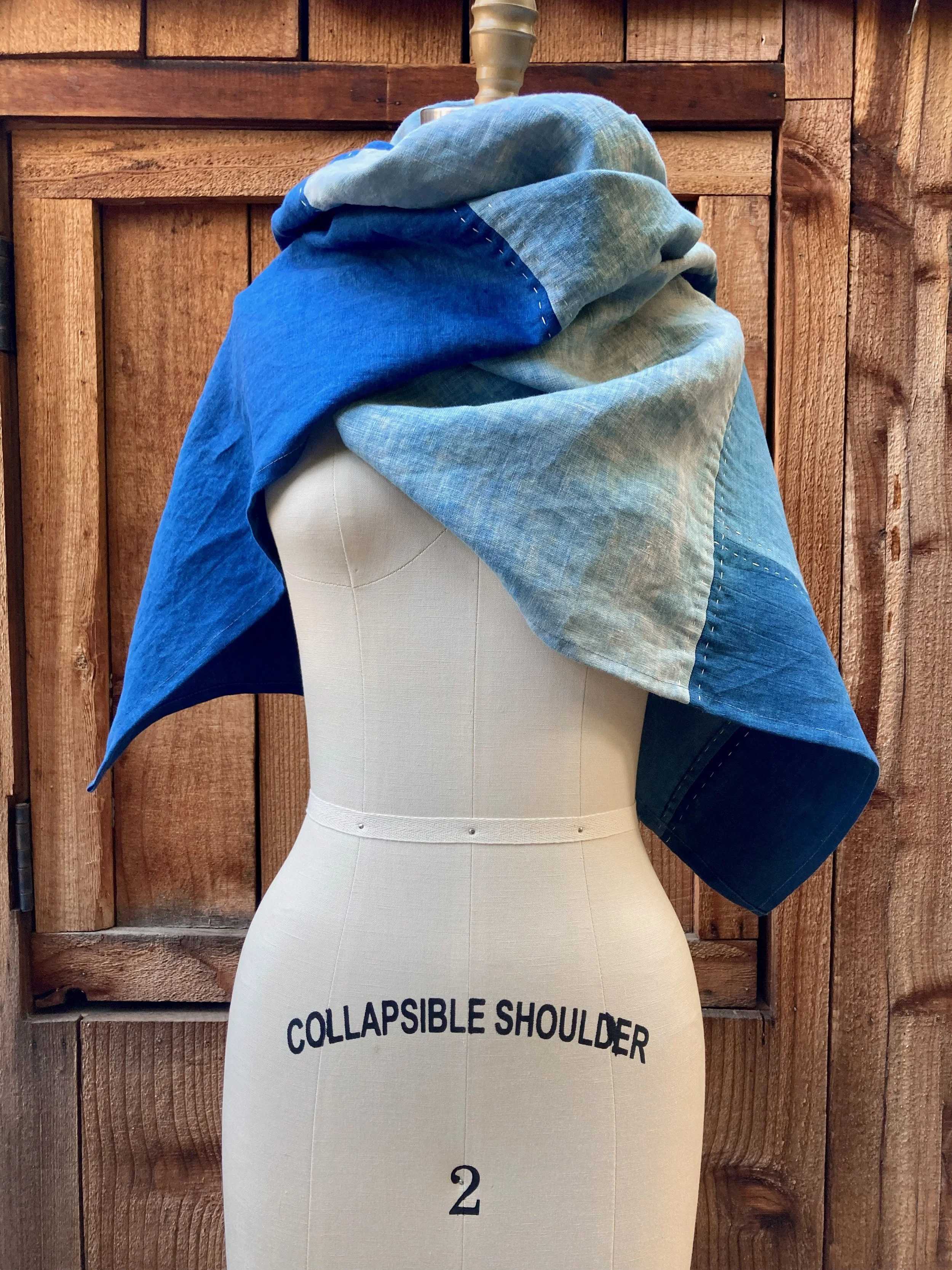 73" long x 17.5" wide. All organic linen. Indigo dyed in my workshop. Hand stitching throughout. This style scarf is seriously luxe. Amazing hand, drapes beautifully, long enough to arrange on the neck in myriad ways. Make your statement with this lovely, and do it with style.